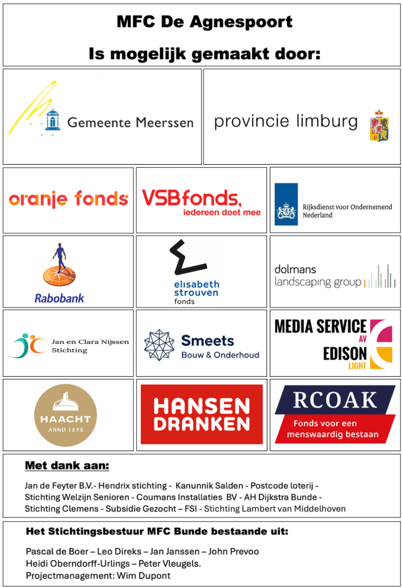in 2025 zal de Agnespoort haar poorten openen, deze naam is via een publieksenquête gekozen en weerspiegelt de doelstelling van de stichting MFC Bunde, en verwijst naar de voormalige Agneskerk en de poorten die we willen openzetten voor eenieder